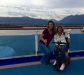 The first full day of the cruise was spent at sea on the way to the inside passage, so we slept in, had breakfast in bed, played bingo, and just a bunch of other cruiseship activities. We got a little dressed up that night, and took part in the ship's version of the voice singing competition's preliminaries. All throughout the day and the evening, I had no problem getting around the ship on my scooter. There were some areas leading to outside decks where the doors were very heavy and the ramps to get over the doorway thresholds were quite steep. There is always someone around, so had I been by myself I'm sure I would've had some help. But it was definitely nice to have Erin there with me to open the doors.