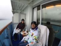 I had seriously been anticipating this day when we would be cruising on water like glass and hopefully watching some glaciers cleave. So imagine my disappointment when I woke up and saw nothing but fog and a misty drizzle. However, Erin soon lifted my spirits by reminding me that we had scheduled a luxury champagne breakfast that morning on our balcony to enjoy while cruising past the glaciers. I don't even remember everything that came with the breakfast, but I do remember that it was absolutely amazing. Erin took the comforters off of our beds, then put them on the two chairs on the balcony so we could wrap ourselves up. After getting ourselves bundled up in warm clothing, she helped me get over the lip onto the balcony and seated comfortably. Then we just started eating and drinking for the next three hours. I was so comfortable in my clothing and that comforter that I actually napped for 30 minutes in my chair!