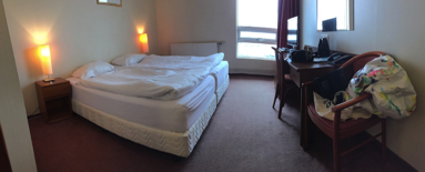 I got to my hotel VERY early because my flight landed at 6:30am. I catnapped on a lobby couch until my room was ready at 11:30am. My room is spartan, but adequate. Lodging (and pretty much everything else here) is very expensive, but at least it's clean and I can sleep. The bathroom is okay; as promised, I have a roll-in shower, but it's a rainfall shower head that isn't removable over a bath chair. Again, it's doable with some practice. There are, however, no grab bars. Obviously there's no ADA here in Iceland, but it would seem to make sense to put grab bars in a bathroom that is clearly meant for someone in a wheelchair. Whatever.