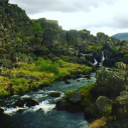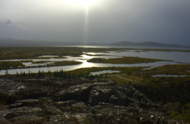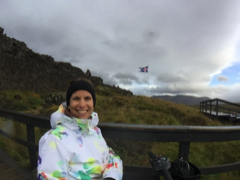 Anyway, when we got to Pingvellir, the steady drizzle magically paused for the hour or so that we were there (although the 25 mph winds were not so kind). The solid cloud ceiling also broke in a small spot so the sun that was trying SO hard to come out made a very brief appearance. The first vista point is really stunning; it overlooks a broad swath of land with a meandering river, mountains in the background...and the meeting of two tectonic plates behind me. Yeah; I'll get to that in a minute.