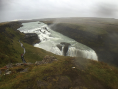 At this point the rain was coming down in more than a drizzle, and I was having a hard time keeping my phone (a.k.a. camera dry). Fortunately we only had one more stop--the famous Gulfoss waterfall. We had a bit of an unexpected challenge here. While there is a great ramp that leads to the scenic overview, there was this weird (and large) gap between the concrete sidewalk that hugs the visitor center and the ramp. There was no curb drop to the gravel either, so Christian and I had to go to the parking lot tarmac, put my scooter in neutral, and he had to push me through loose gravel onto the ramp. Not sure what the geniuses here were thinking, but whatever. My battery was getting low on my scooter and I was getting pretty wet and cold, so we only stayed long enough to get a few photos and some video of the impressive two-tiered waterfall.