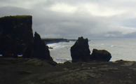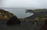 A few minutes later we stopped at an overlook next to a lake. Down below was a black volcanic sand beach exactly like what you would see in Hawaii (minus the sunbathers, of course). The low green-and-black mountaintops disappeared into the low clouds, but the images were fantastic. I was able to collect a few lava rocks for my friends, and I hope they'll be pleased with the unique souvenir.