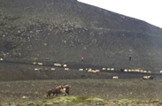 We started the drive to our next scenic spot and got to see many more lava fields. Suddenly my guide hit the brakes because there were several cars parked half on the roadway (there are no shoulders here). At first he was mad, but then we saw what the fuss was about. Sheep roundup!!! First, you have to understand that there are sheep EVERYWHERE in Iceland--pretty much three for every man, woman, and child in the country. At this time of year, ranchers use Icelandic horses (which are small and look like miniature horses) to round up the sheep in this area to prepare them for slaughter. Hey, the yummy lamb dinners have to come from somewhere. Well, catching this roundup in the act is a rarity, according to my guide, but we saw it! It was so cool to see the horses guiding the very long line of sheep along the coast.