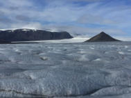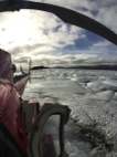 Anyway, we started heading toward our first landing site--the Langjökull glacier. Erin and I did a landing on the Taku glacier in Alaska, and I thought that was big. Well, this one is 50 KILOMETERS WIDE. Yeah, I had a hard time wrapping my head around that, especially after I saw what looked like just a miles-long snow field. Yep, it was all solid (and slowly moving) ice, surrounded by low charcoal-colored mountains. Just like in Alaska, I felt like we had landed on another planet. The Taku glacier there had very defined edges, whereas the Langjökull glacier is more rounded and looks (ironically) like a slow lava flow. Also like in Alaska, you could hear running water everywhere.